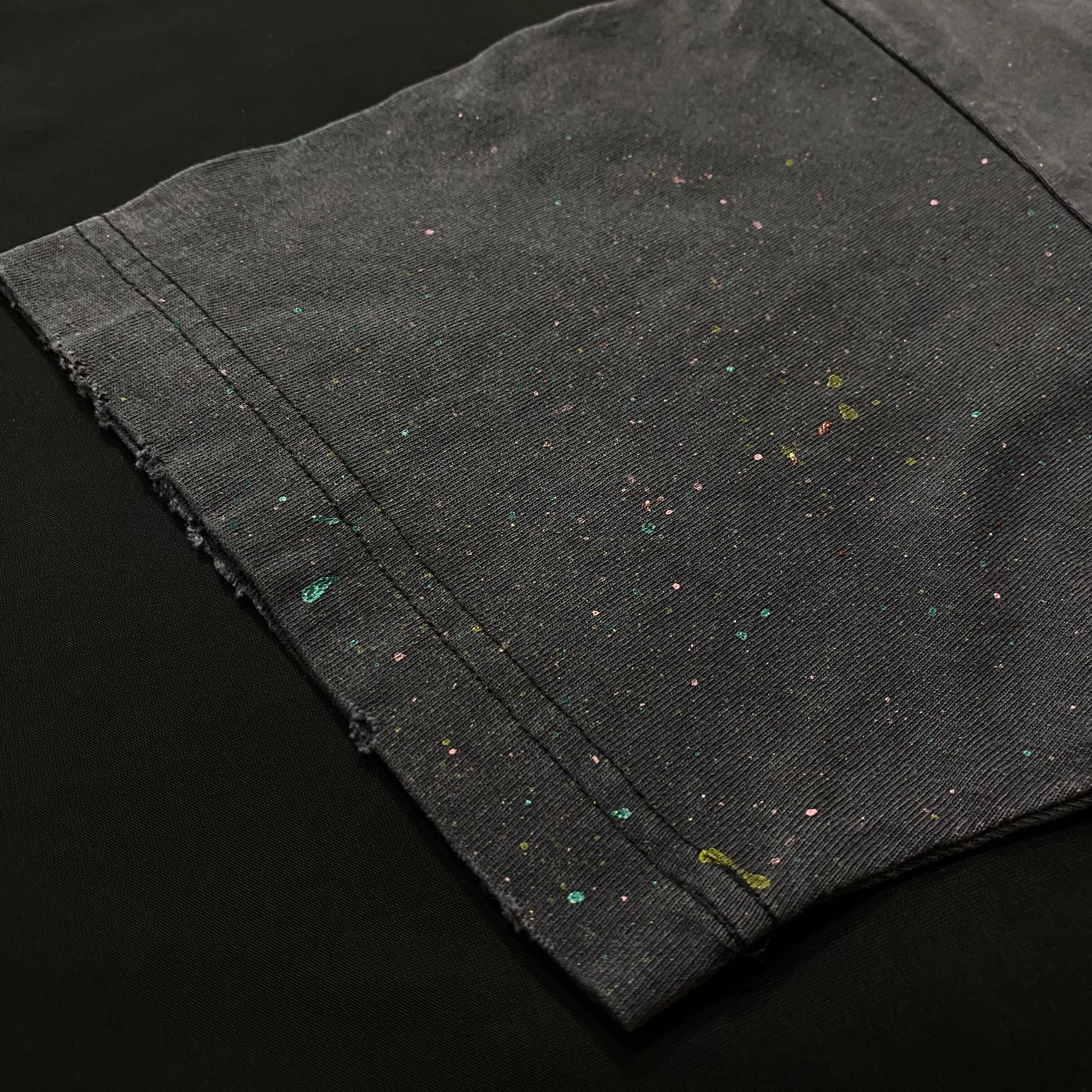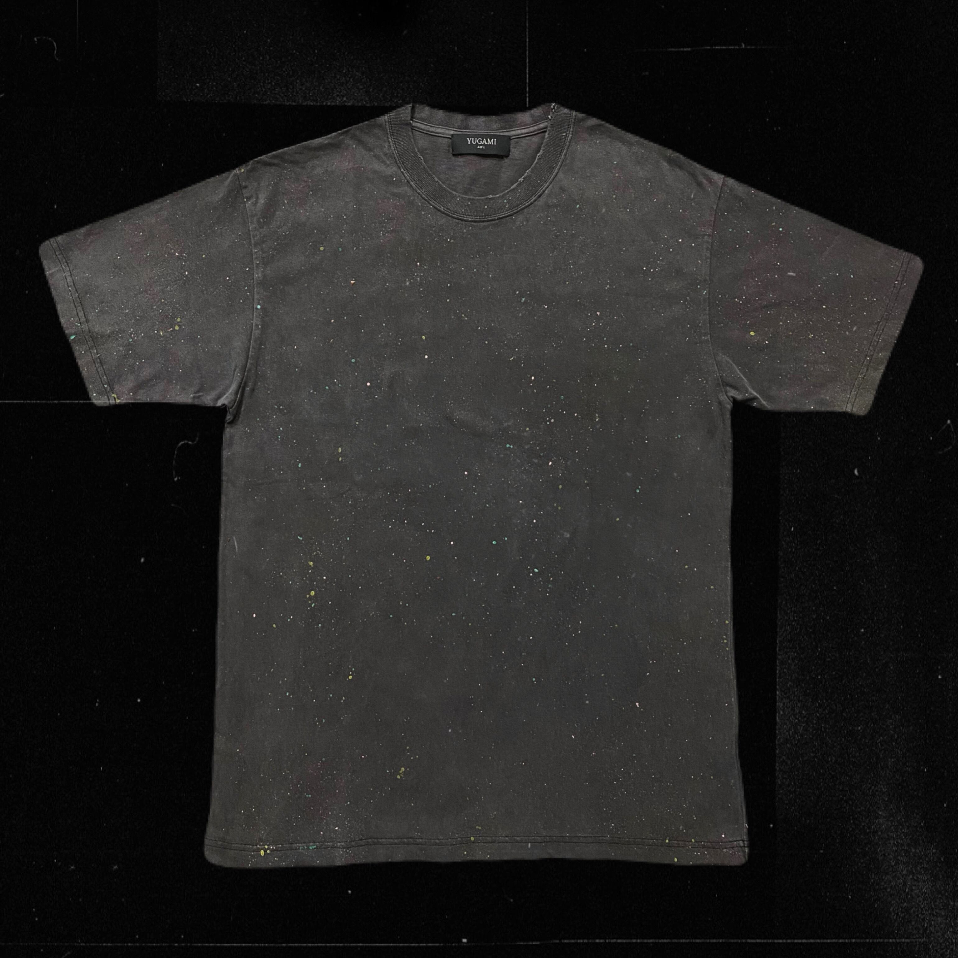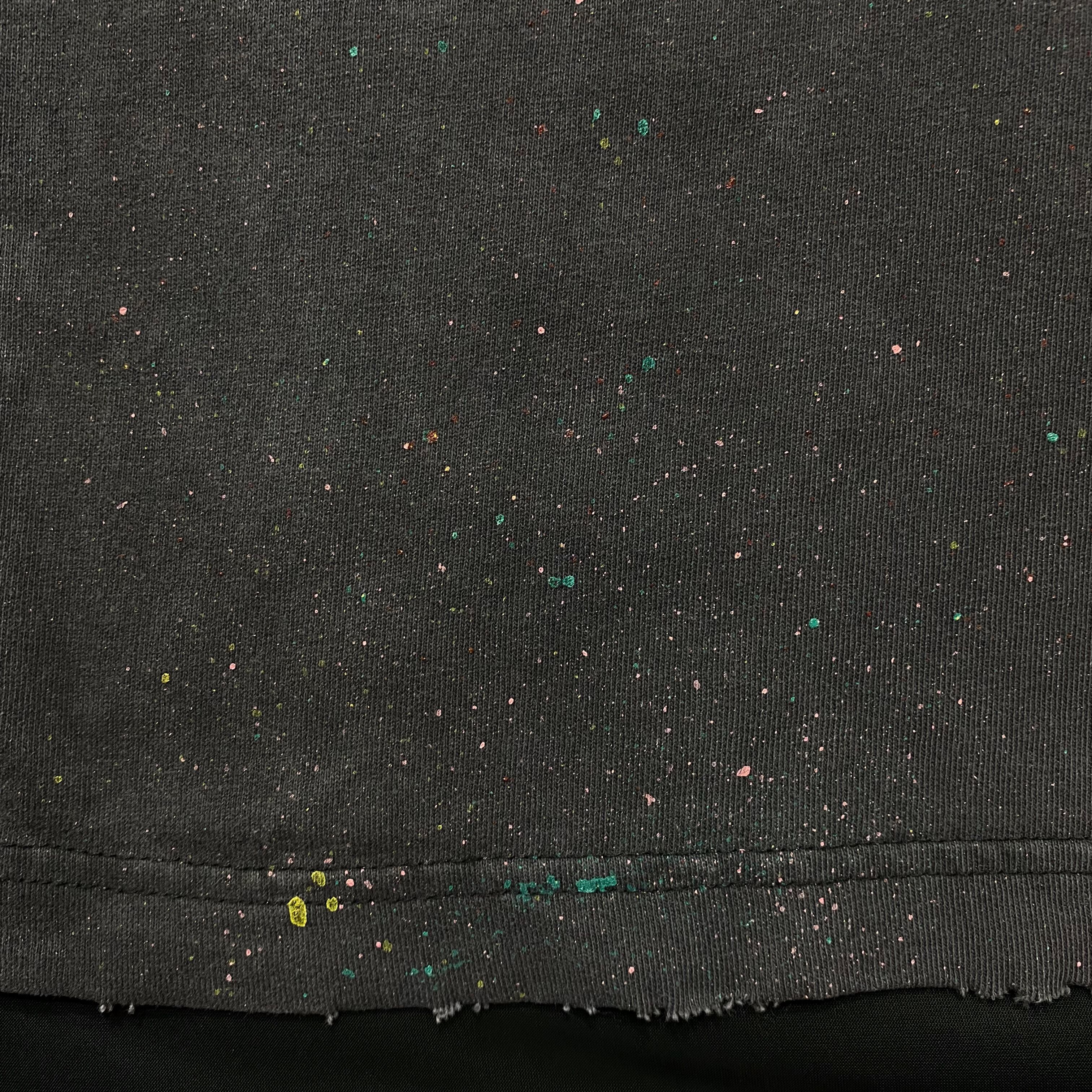 顔料染め加工で、古着の風合いを帯びたボディに、四色のペンキが細かく散りばめられたTシャツ。随所にダメージ加工を施し、全て手作業で仕上げられている。