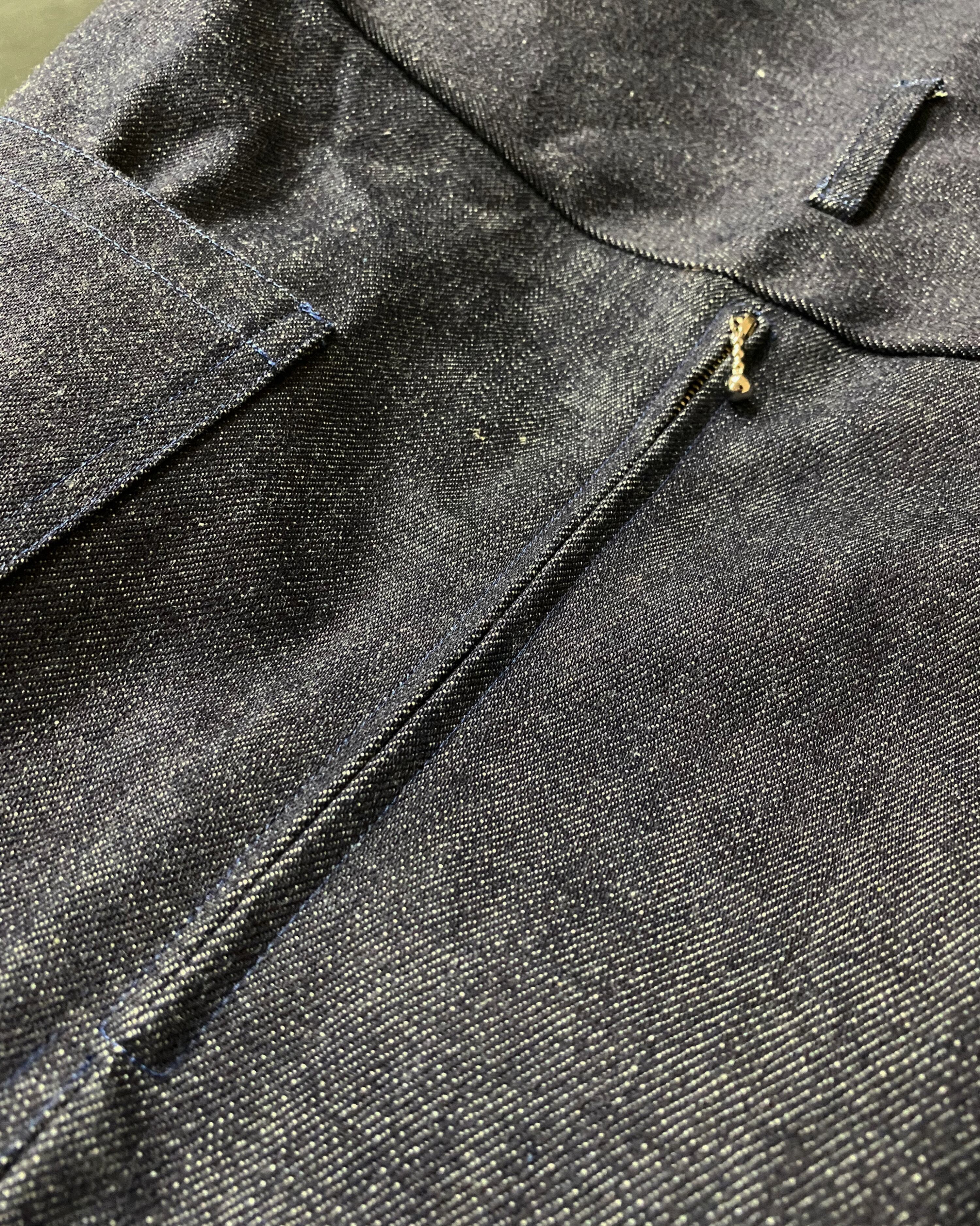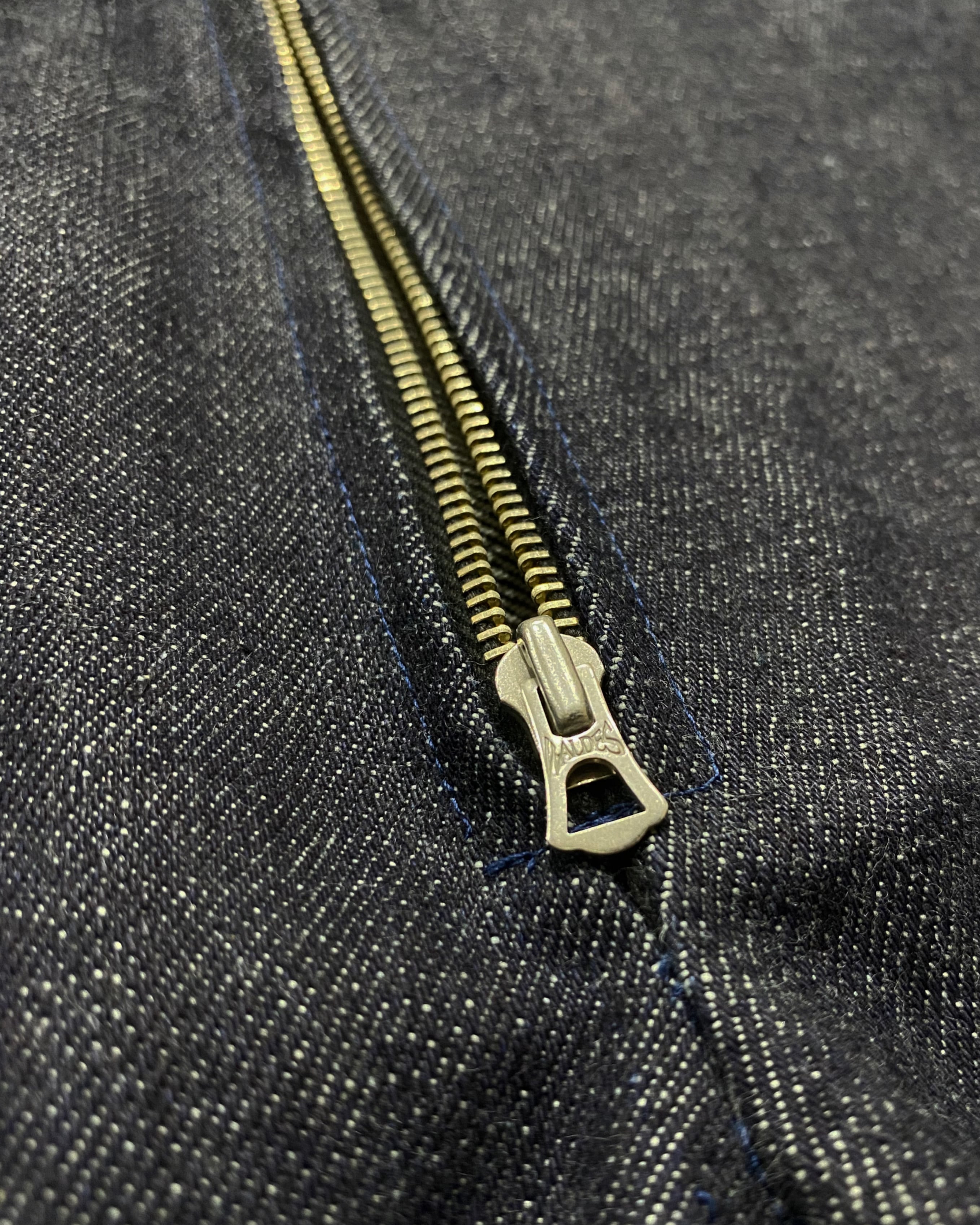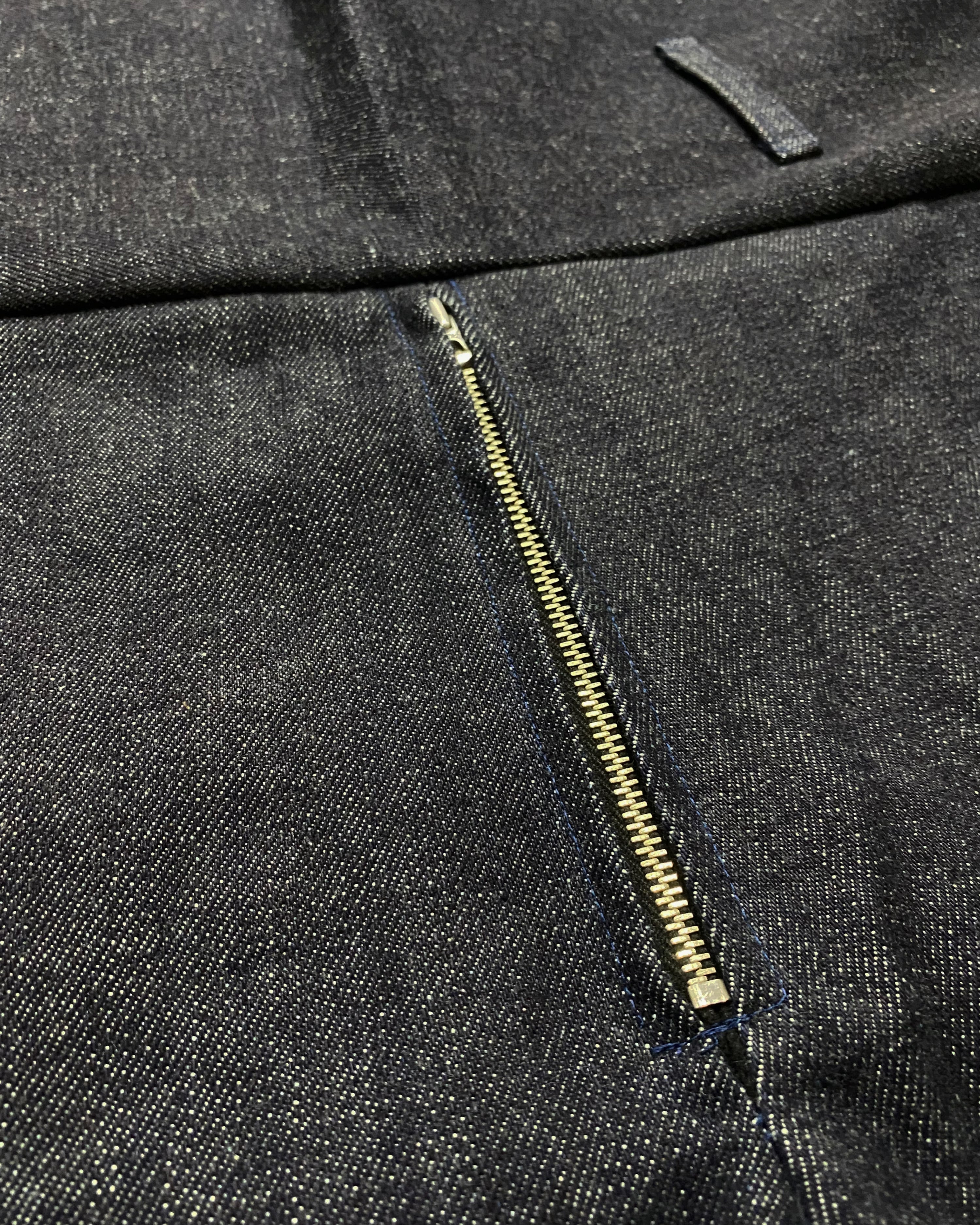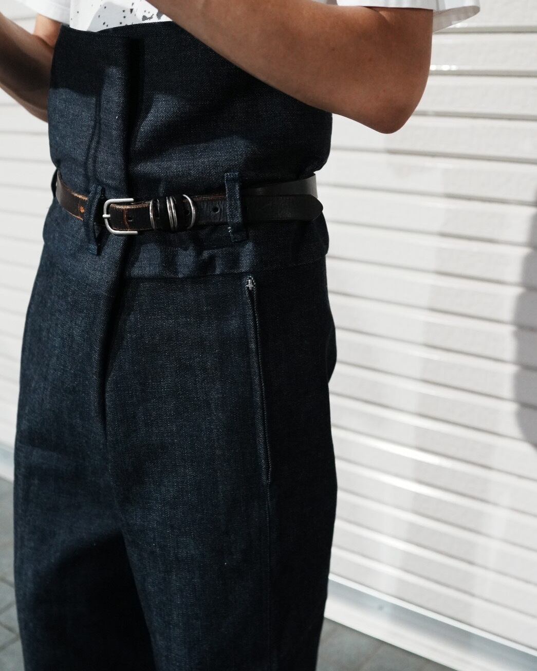 13オンスの厚手リジットデニム生地を使用したオーバーパンツ。レイヤードを想定して作られたワイドシルエットで、ウエストは贅沢に余す生地を折り畳んでベルトを通す。フロントジッパーはヴィンテージ好きなデザイナーSakiが愛すWALDES社を使用。