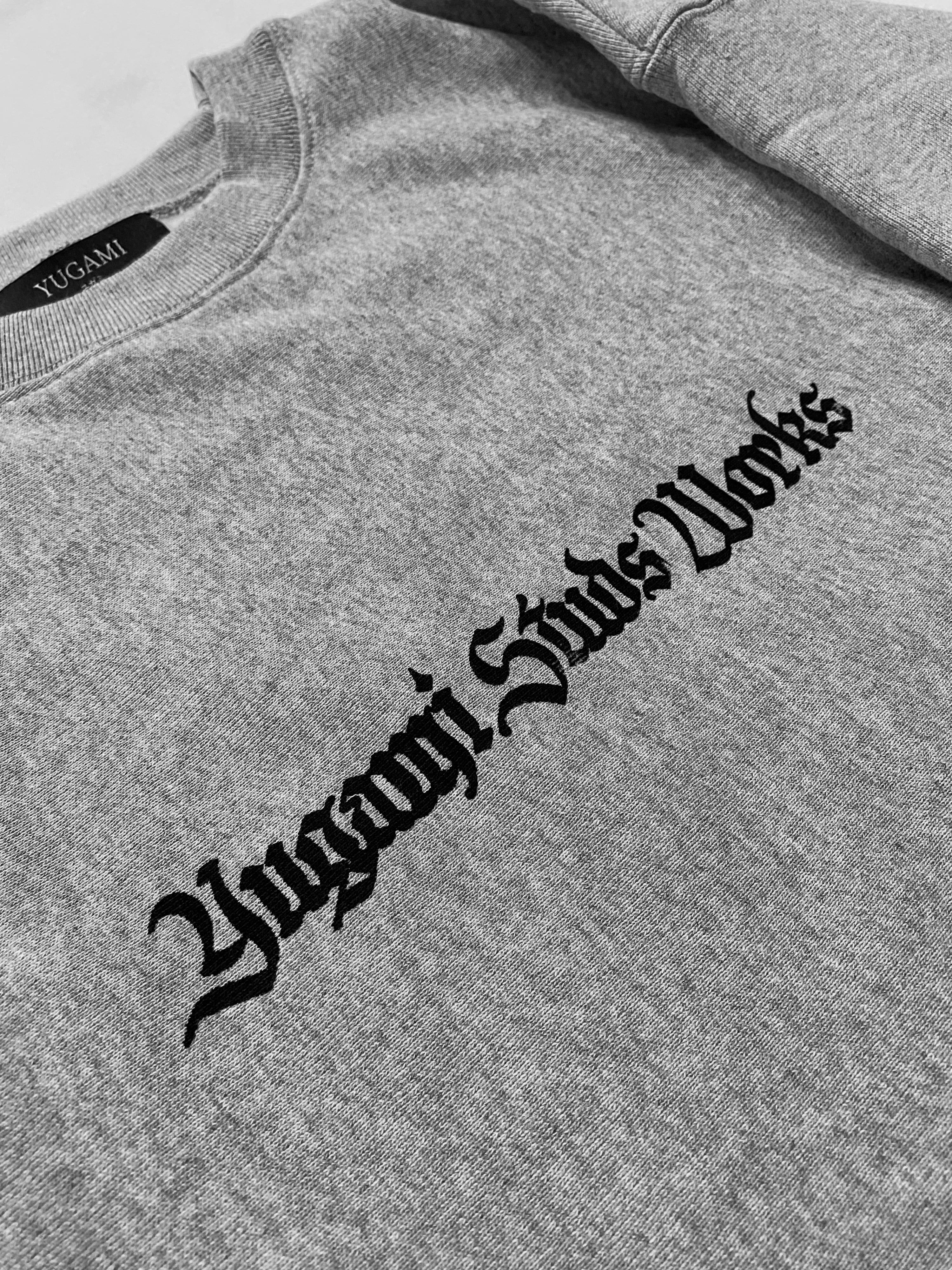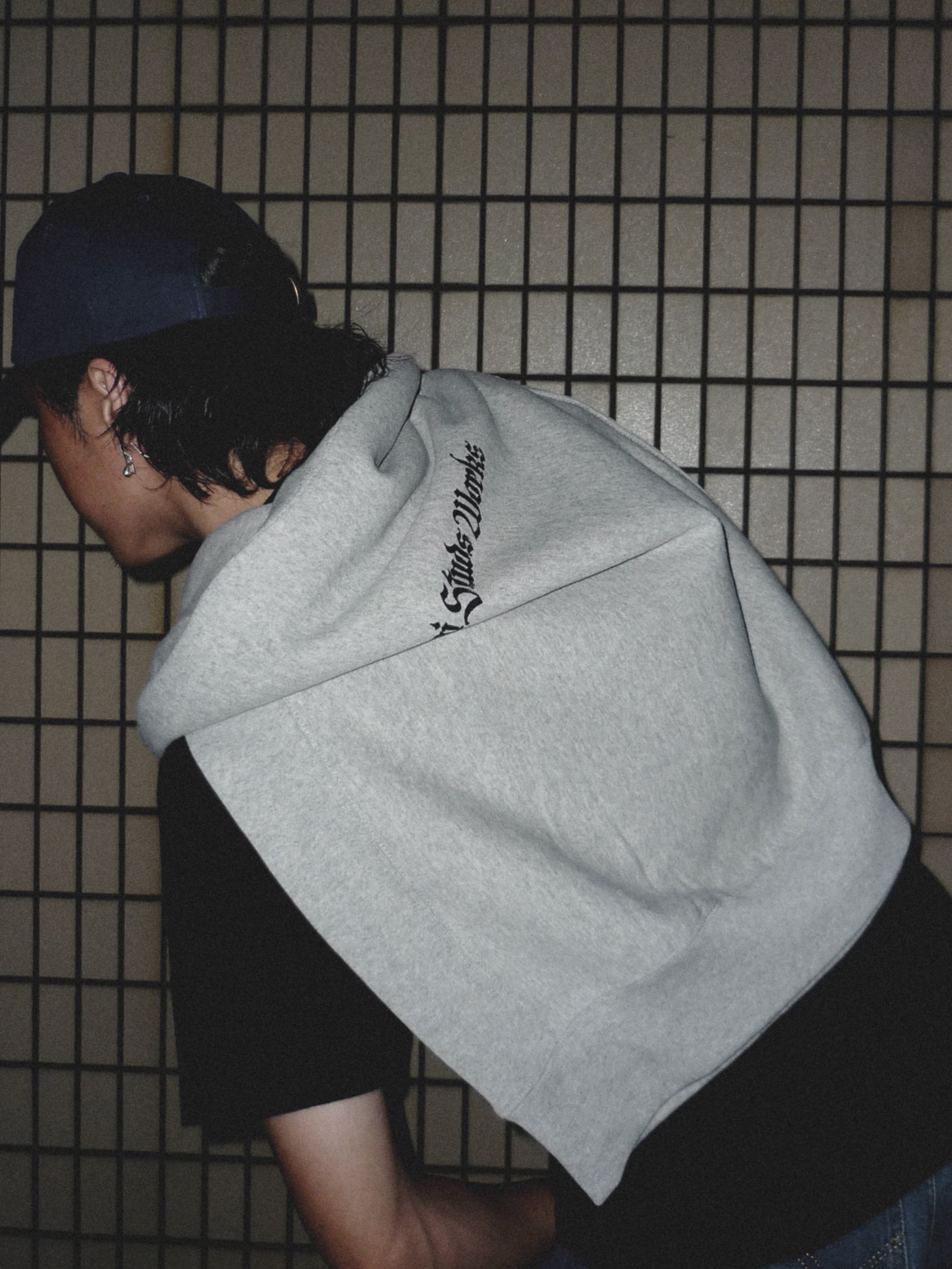 ブランドの新ロゴと、"スタッズワークス"の文字がプリントされた12オンスの厚手スウェット。スウェット胴部は生地を横に使うリバース仕様。