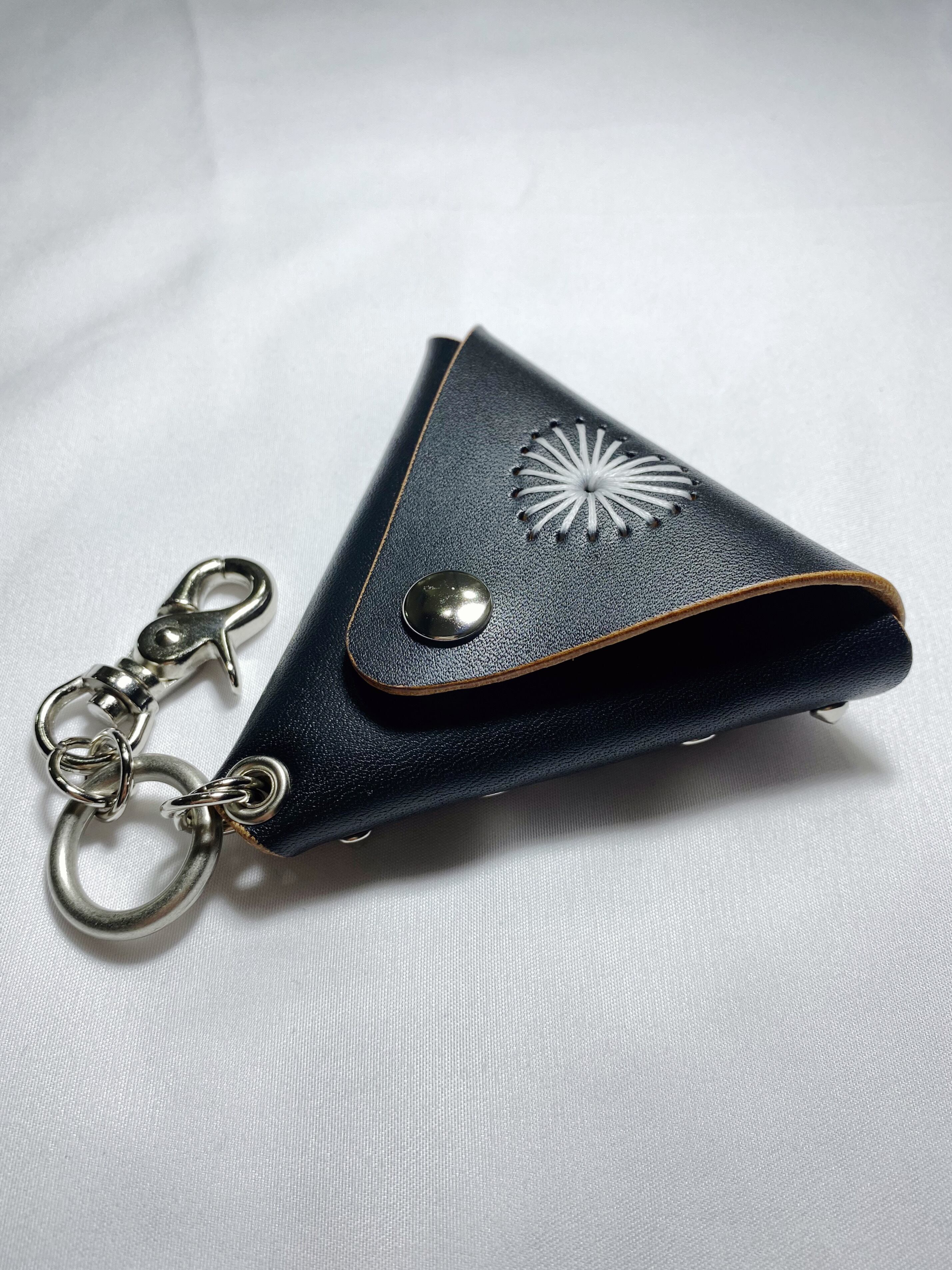 古来からあるトライアングル型のコインケースをチャーム仕様として、ベルトループやバッグに取り付けるサイジングに仕上げられている。