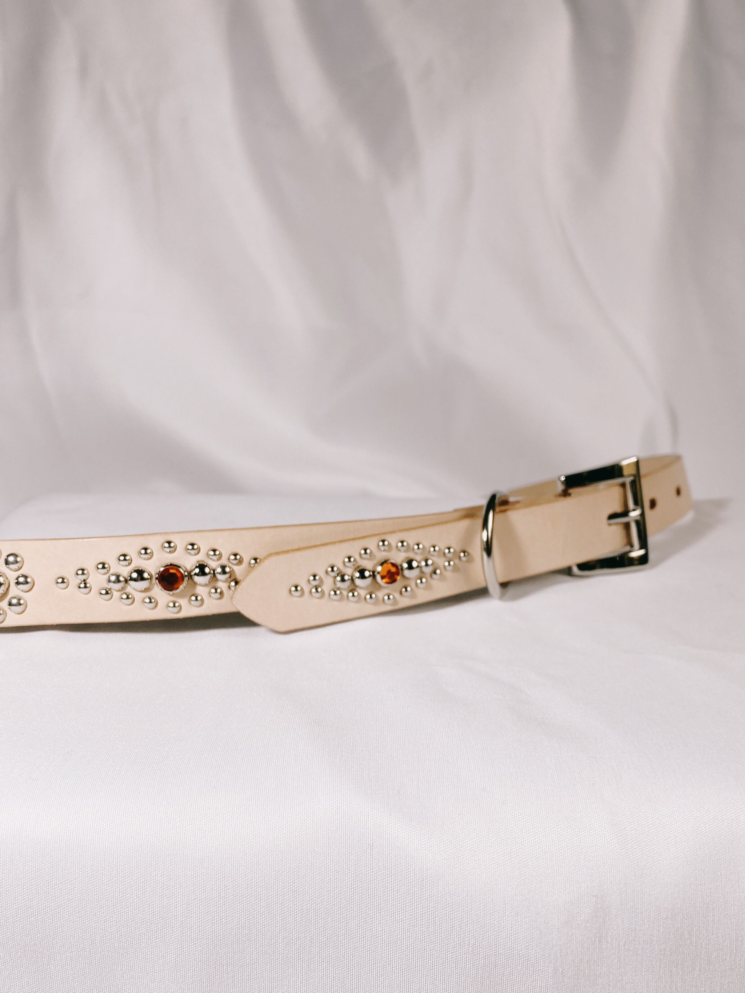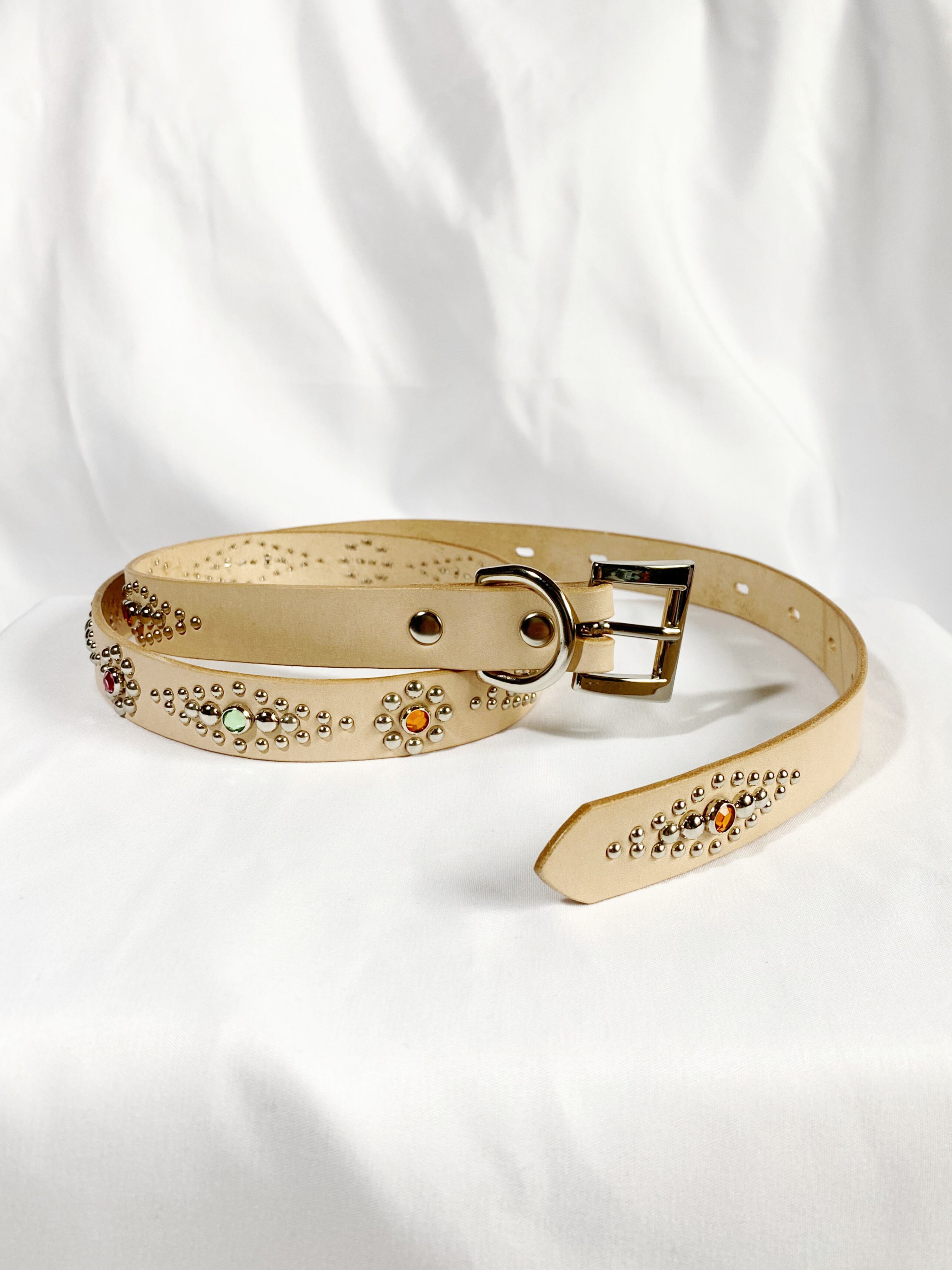 人気のスタッズベルトシリーズのオンライン限定"Natural"カラー。ダイヤ型と花型のリピート。