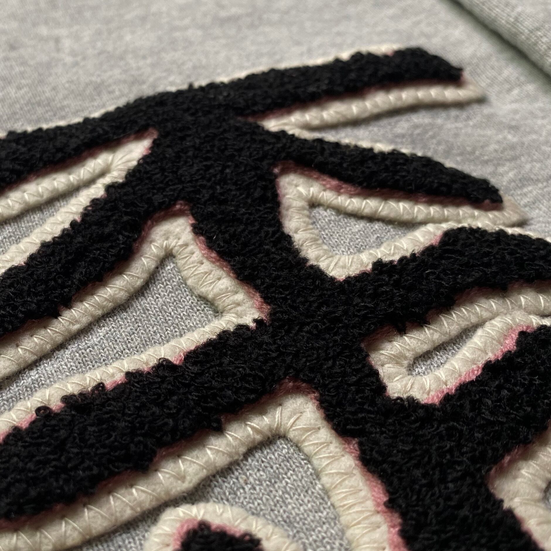 ワッペンは表面をパイル地のように仕上げるサガラ刺繍と、アウトラインにスモーキングピンクのチェーンステッチが施されている。右下に大きさの異なるシルバースタッズを配置。